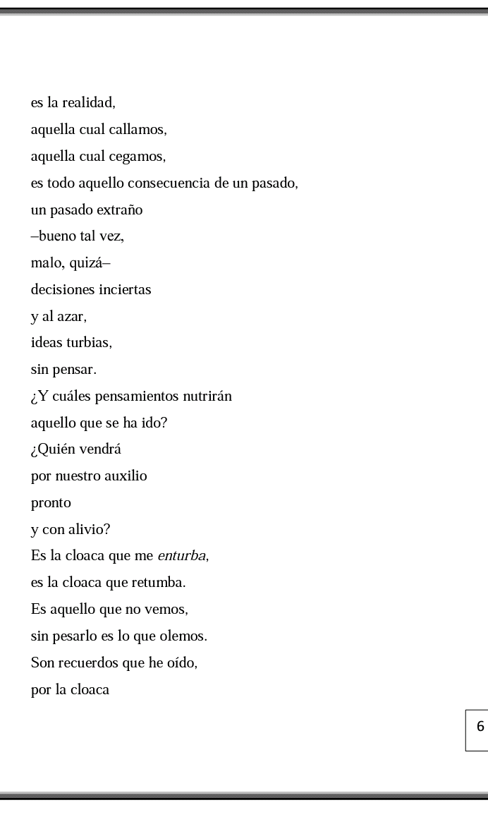 Mi compañero me lleva a mi casa. Sigue hablando del virus, como si no hubiéramos visto a un hombre muy probablemente armado en el almuerzo. Llegamos a mi departamento, estaciona en el lugar donde Isabel siempre lo hace cuando llega en las noches. Hoy debe venir. Probablemente le cuente el incidente. Puede que no. Me despido de mi compañero y entro a mi departamento. Me quedo acostado un buen rato hasta que anochece. Escucho el tintineo de unas llaves en la entrada. Voy al baño por una aspirina cuando escucho la voz de Isabel a mis espaldas.